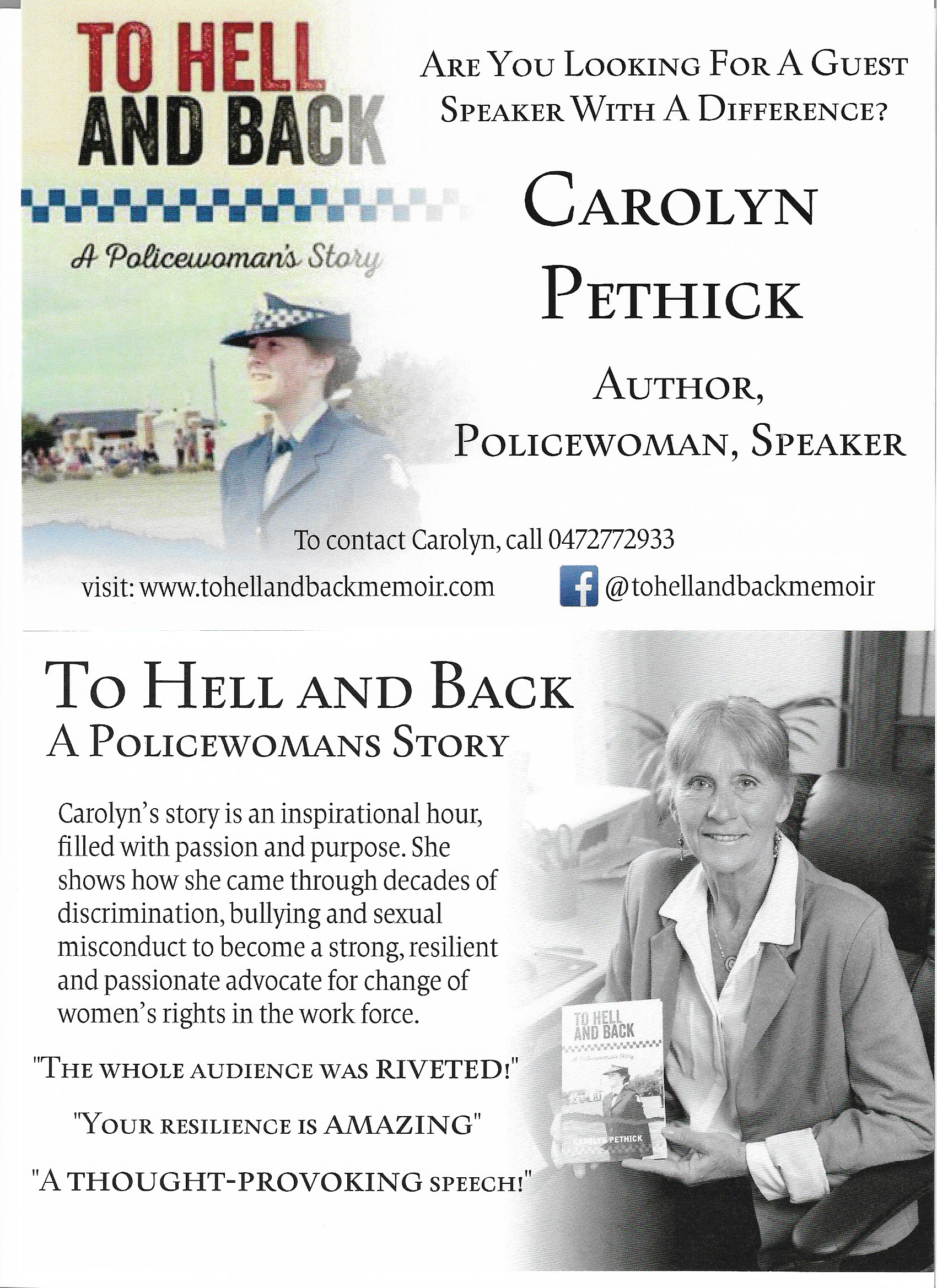 Her resilience and willingness to challenge what she knew was wrong, sometimes at an horrendous cost, have been captured in her presentations and her book, "To Hell and Back – A Policewoman's Story'. Her presentations focus on encouraging women to speak up and report the discriminative treatment that women experience in the workplace on a daily basis as well as sharing the skills people need to be resilient in these situations.