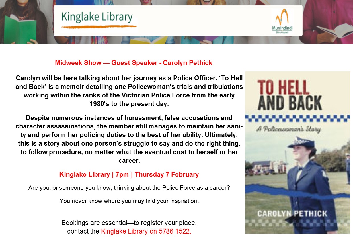 Carolyn Pethick, Speaker and Author. February 2019. As one of our programmed speakers, Carolyn presented her experience as a Police officer in the Victoria police to Grimshaw Probus in 2018. Afterwards her book was on offer for sale. Carolyn's time in the Victoria Police started in very different social times when females were seen as tea makers and also as typists and not valued operational police. Whilst being a difficult atmosphere to work in, it also allowed Carolyn to be sent on assignment to various departments where she wasn't really supervised and given the jobs which were far too boring or difficult or had not hope of being solved. Using her initiative and drive Carolyn was able to become an effective officer solving large scale crime and also impressing her superiors. However the full realisation of a fulfilling career was dominated by the lack of change in the organisation approach to females and ultimately ended her career. Carolyn reached the rank of Sergeant. I found her talk extremely interesting and also harrowing in the way she was treated by the organisation. Especially as I had spent some time in a Police Force in the UK before immigrating to Australia in 1978. Carolyn's story is one of Social history, personal resilience and determination in the face of an entrenched and misogynistic culture. She tells her story simply and calmly and without any rancour as to the way she has been treated. Her book is well worth purchasing and is a good read. Vince O'Grady. Member of the Grimshaw Probus club.