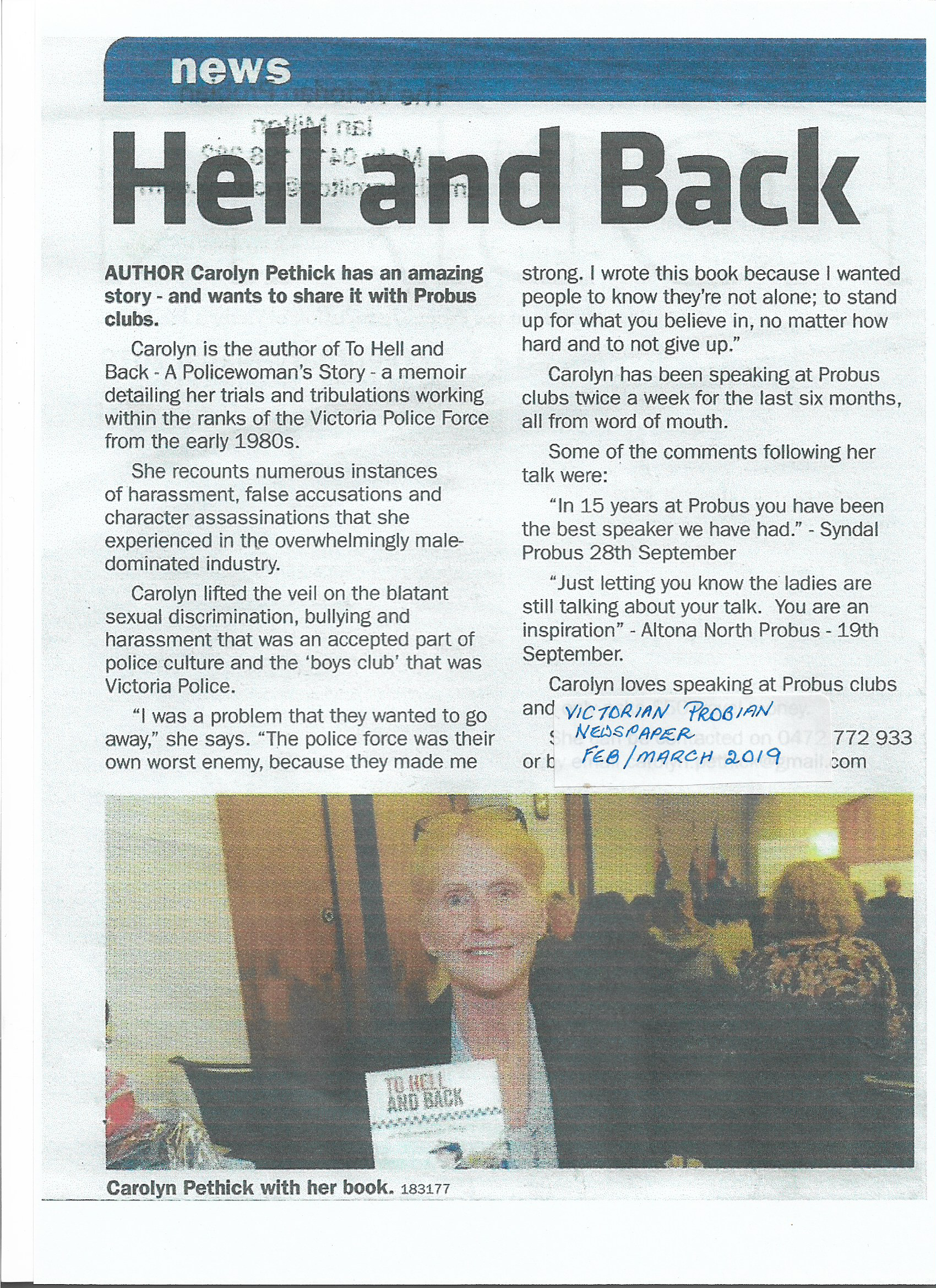 Carolyn Pethick agreed to be Guest Speaker at our General Meeting in August 2018. I received fabulous feedback after the meeting, which was attended by approximately 100 members. Carolyn, an ex-policewoman, gave us all something to think about after her presentation on helping men and women speak up against work place discrimination. Her book - To Hell and Back - was very popular and purchased by quite a few members. The day was a great success and I have no hesitation in recommending her to any group. Helen Russo, Probus Club of Cowes