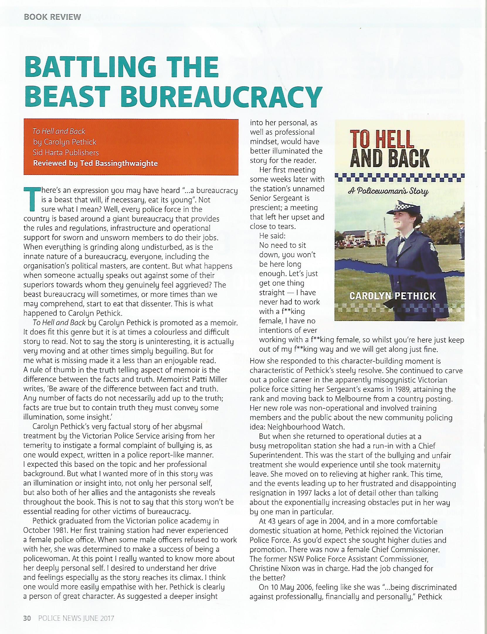 A policewoman's story of discrimination, bullying and harassment. Incredibly difficult subject matter, relating a very personal experience. Equally one can imagine that it would have been a difficult, although hopefully cathartic experience, relating the events Carolyn Pethick outlines in TO HELL AND BACK. I've had many goes at writing something about this book until it finally dawned on me - I can't review a story like this / I'm not comfortable rating something this personal. Whether or not it was an enjoyable, informative or difficult experience reading it, is nothing compared to the author's aim in writing it.